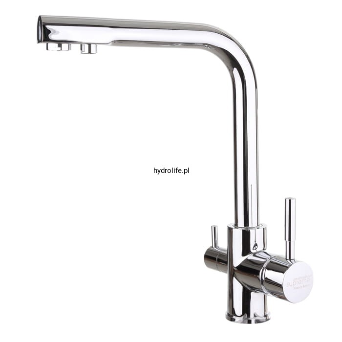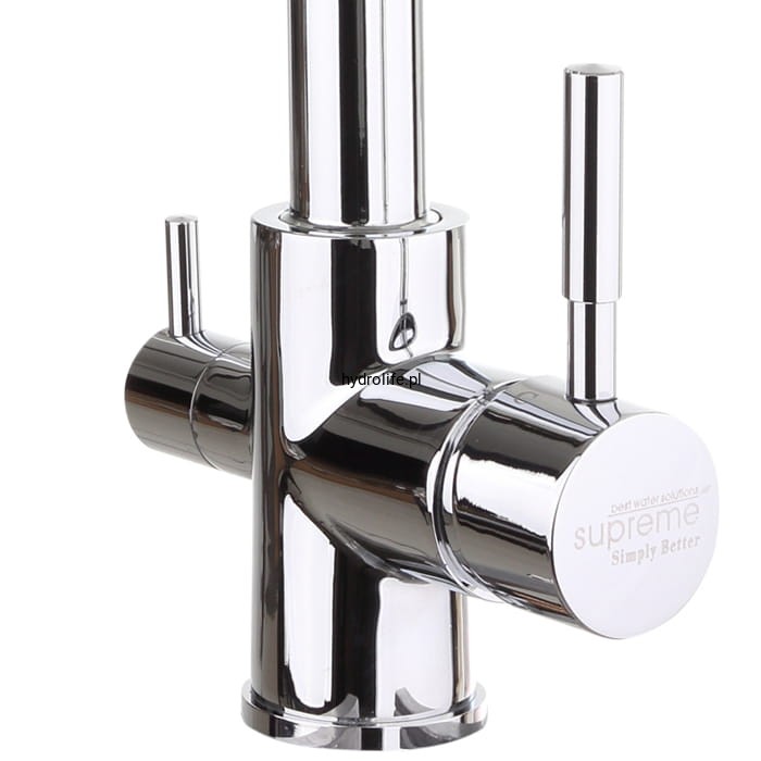 Bateria kuchenna FX03-C marki SUPREME. Umożliwia podłączenie wody sieciowej, zimnej, ciepłej, a także wody filtrowanej z jednego punktu. Jest wykonana z wysokiej jakości materiałów odpornych na korozję. Prezentowany model jest dostępny w wersji chromowanej (błyszczącej).