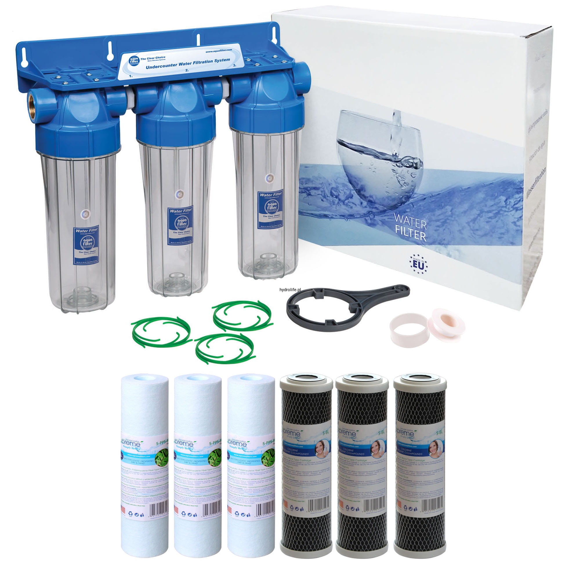 Trójstopniowy zestaw narurowy marki AQUAFILTER z zestawem wkładów mechaniczno – węglowych marki SUPREME.