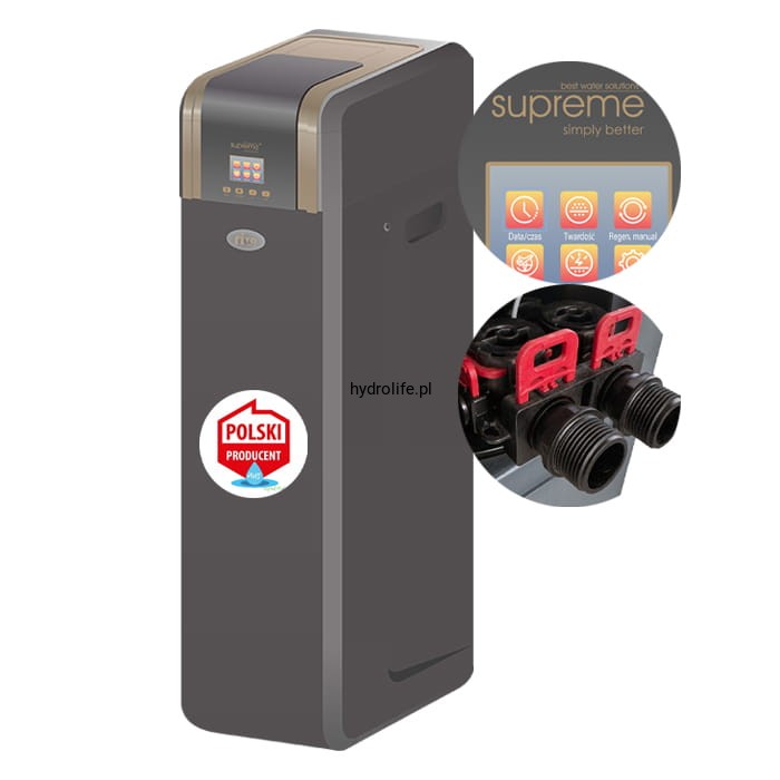 - Systemy SUPREME RIVA zapewniają bardzo skuteczną pracę nawet na wodzie bardzo twardej, dzięki zastosowaniu wysokiej jakości żywicy jonowymiennej o niskim współczynniku zużycia. Przekłada się to na długi i efektywny czas eksploatacji oraz praktycznie bezawaryjne działanie urządzenia.