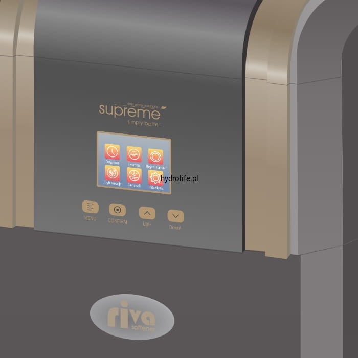 - Systemy SUPREME RIVA zapewniają bardzo skuteczną pracę nawet na wodzie bardzo twardej, dzięki zastosowaniu wysokiej jakości żywicy jonowymiennej o niskim współczynniku zużycia. Przekłada się to na długi i efektywny czas eksploatacji oraz praktycznie bezawaryjne działanie urządzenia.