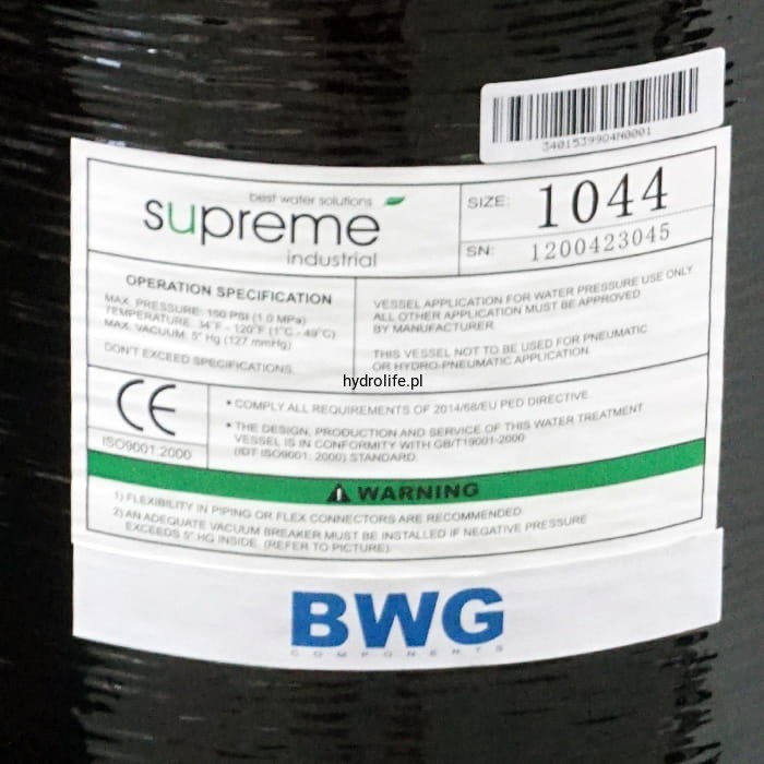9. BUTLA SUPREME INDUSTRIAL/BWG: W systemie została zastosowana wysokiej jakości butla ciśnieniowa SUPREME INDUSTRIAL/BWG, która zapewnia doskonałą pracę całej jednostki, a także gwarantuje dokładne płukanie żywicy.