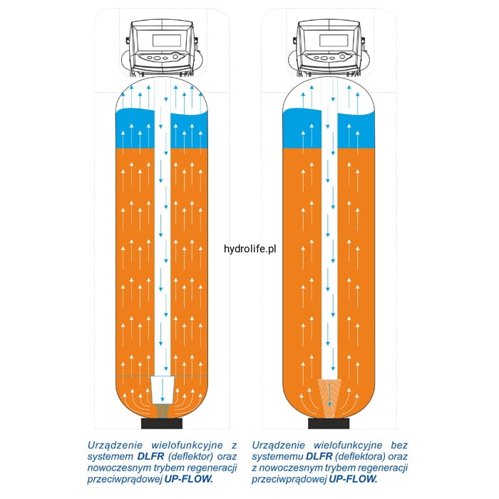 3. DEFLEKTOR (DFLR): W systemie SUPREME-LOGIQ 75D został zastosowany nowoczesny, unikalny system dystrybucyjny oparty na pracy deflektora (DFLR). Dzięki systemowi DFLR woda przepływa przez całą powierzchnię złoża, zwiększając efektywność zmiękczania wody oraz równomierne wykorzystanie całej żywicy jonowymiennej. Połączenie technologii deflektora (DLFC), systemu regeneracji przeciwprądowej UP-FLOW, możliwości pracy w oszczędnym trybie „zmiennej funkcji rezerwy”, umożliwia, realne mniejsze zużycie wody w cyklu regeneracyjny, mniejszą emisja popłuczyn, mniejsze zużycie soli oraz równomierne wykorzystanie złoża, co przekłada się na dłuższą jego żywotność.